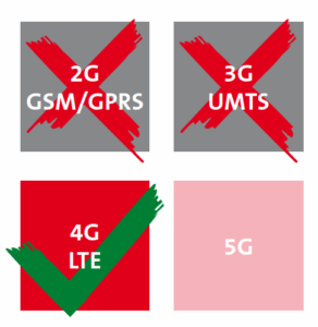 In Deutschland haben die Telekom und Vodafone unterschiedliche Zeitpunkte für die Abschaltung des 2G‑Netzes definiert. Nach aktuellen Planungen wird bis Ende 2028 das 2G‑Netz von Vodafone und bis Sommer 2028 der Telekom abgestellt werden. Telefonica/O2 hat noch keinen Zeitpunkt für die 2G‑Abschaltung bekanntgegeben. Diese Termine erscheinen in weiter Ferne, allerdings ist bereits heute eine Depriorisierung des 2G‑Netzes seitens der Netzbetreiber spürbar. Bei hoher Netzauslastung (z. B. bei Großveranstaltungen) ist eine sichere Übertragung im 2G‑Netz nicht mehr in allen Fällen gewährleistet.